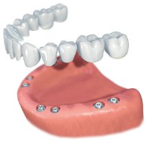 Alternatively, up to 5 or 6 implants can be placed in an upper or lower jaw where all the teeth are missing. A fixed bridge is then attached to the implants to replace all the missing teeth. The fixed bridge remains in position and is not removed.