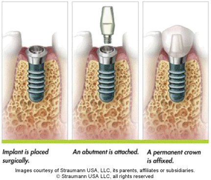 In the case of a missing single tooth, once the bone has integrated with the implant (from 8 weeks to 6 months) an abutment is attached to the implant and a crown can then be seated on the abutment, to replace the missing tooth.